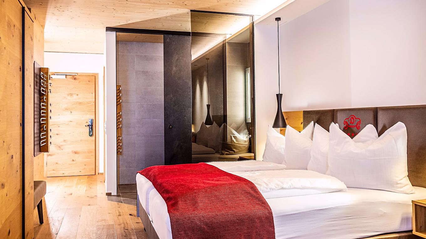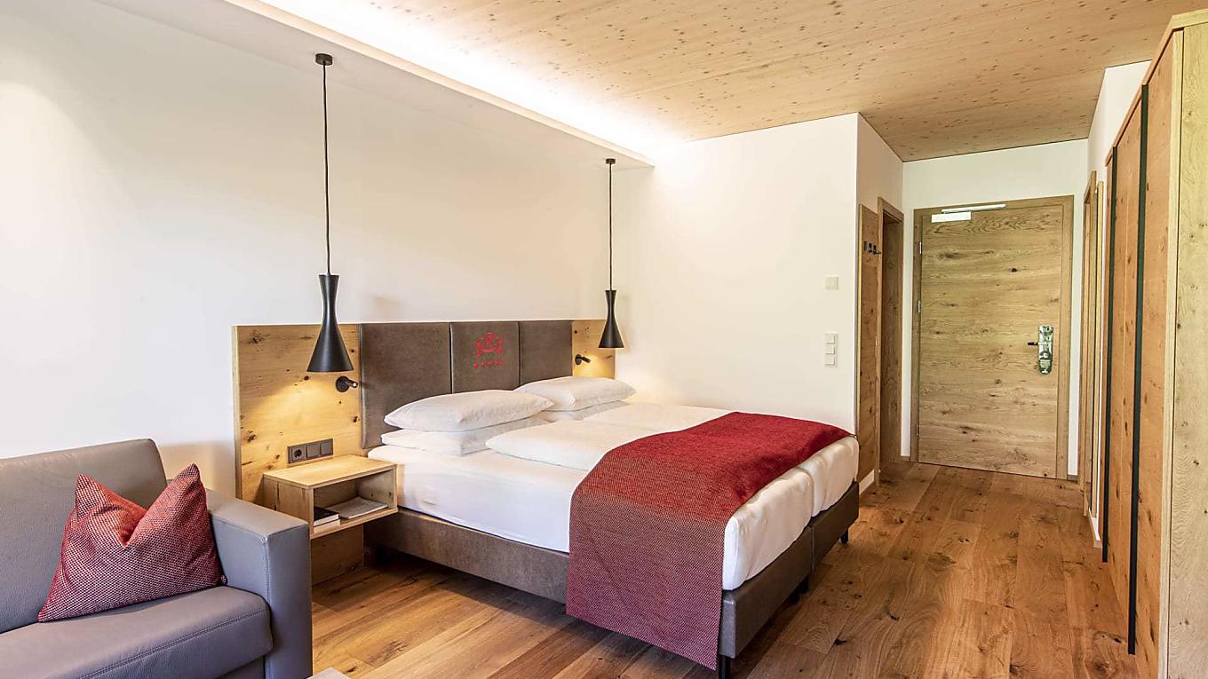 Die Doppelzimmer in den oberen Etagen begeistern mit einem wunderbaren Ausblick und einer gemütlichen Sitzecke – ideal zum Entspannen. Ausgestattet mit Holzboden, Dusche, WC und einem Balkon, der je nach Lage nach Süden, Westen oder Norden ausgerichtet ist, bieten diese Zimmer stilvollen Komfort inmitten der Natur.