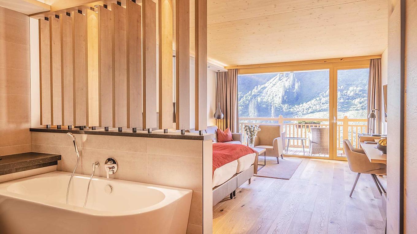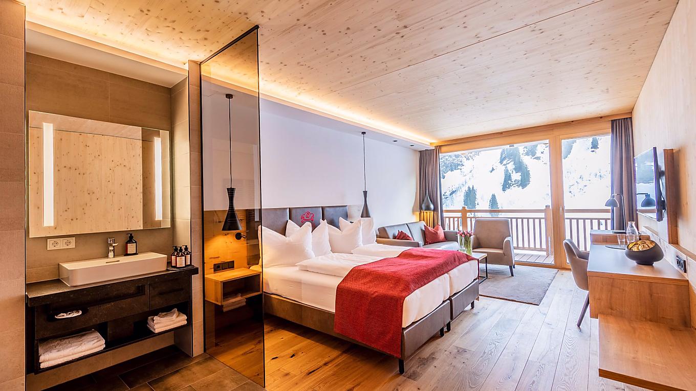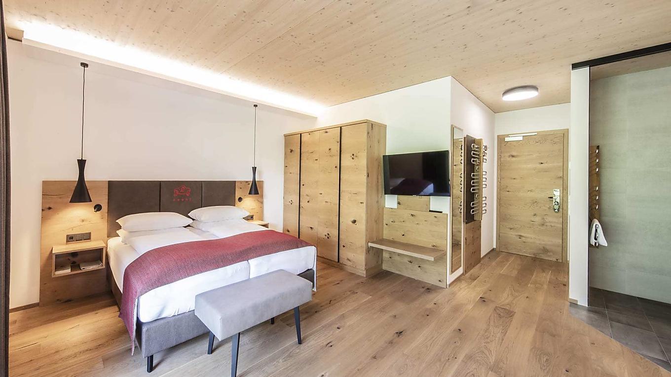 The Alpensuite offers plenty of space and a comfortable sitting area for pure relaxation. Thoughtfully designed, it creates a harmonious atmosphere for a rejuvenating stay. With wooden flooring, a shower and partially a bathtub, a separate WC, and a balcony, the suite combines elegant style with alpine charm. If needed, there is space for 1–2 extra beds for children, making it ideal for families.