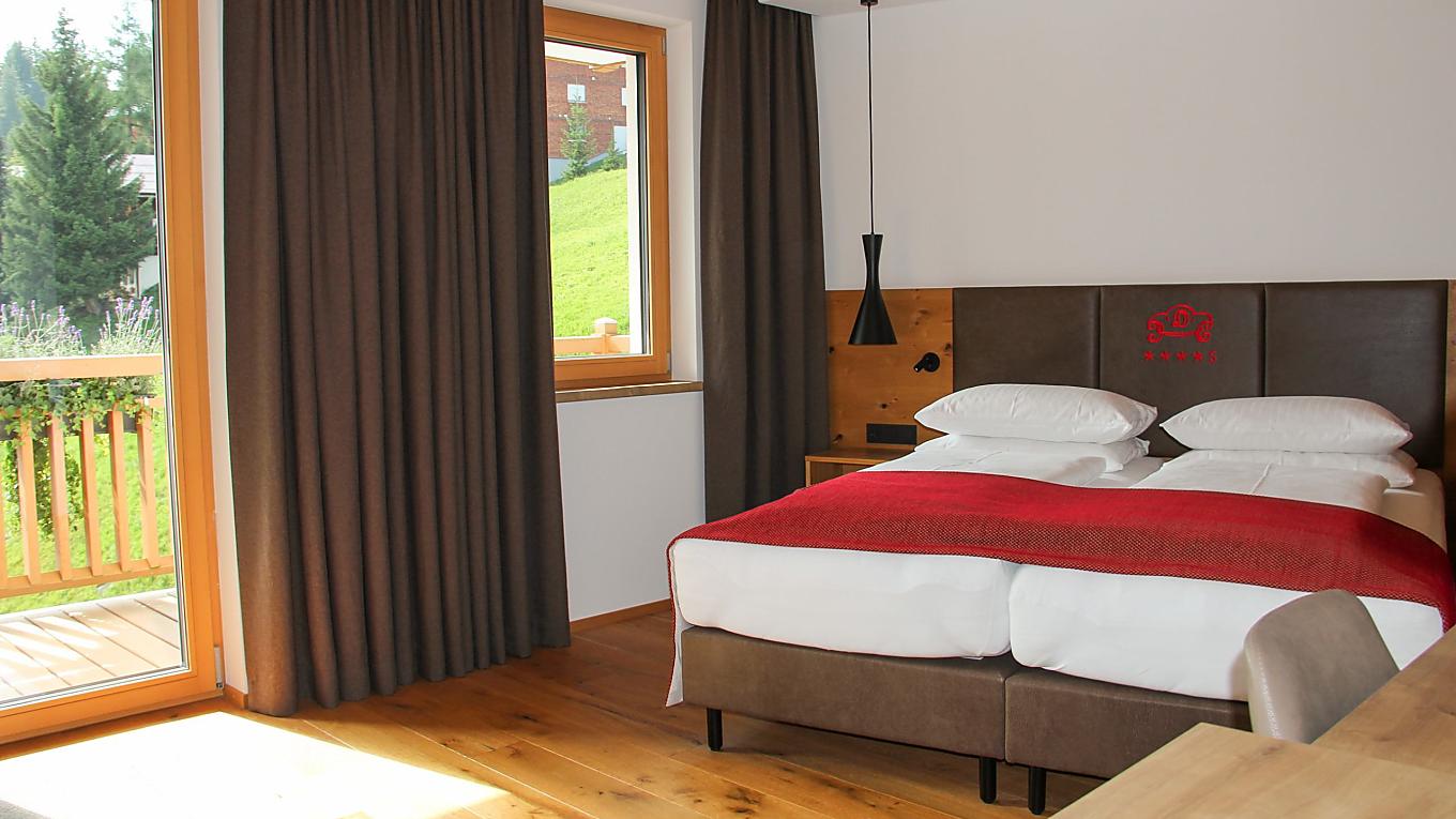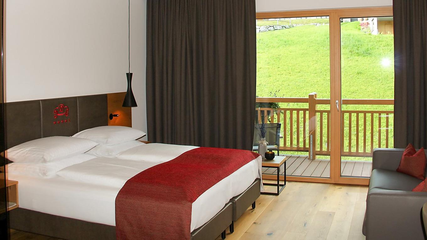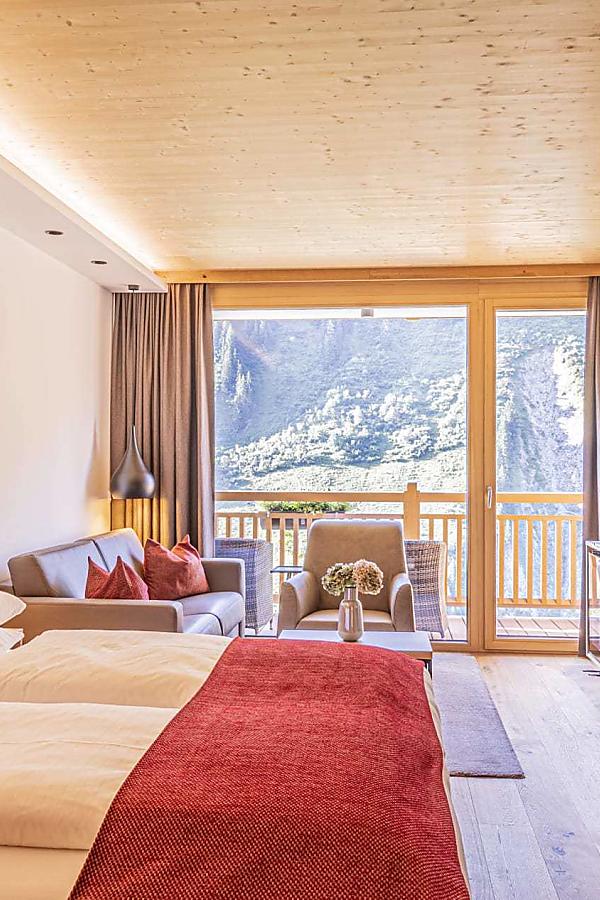 The double rooms on the upper floors impress with a stunning view and a cozy sitting area – perfect for relaxation. Featuring wooden flooring, a shower, WC, and a balcony, which faces south, west, or north, these rooms offer elegant comfort surrounded by nature.